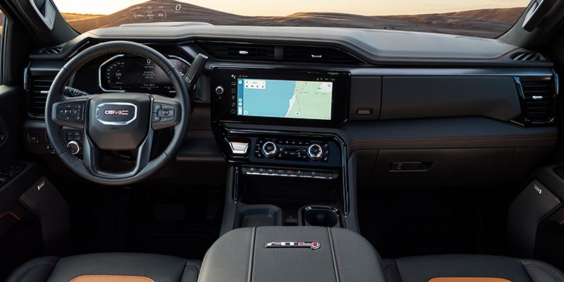 Sierra HD Denali Ultimate’s Alpine Umber interior features full-grain leather seating, plaited contrast stitching, and embossed and laser-etched topographical map patterns of its namesake’s mountain summit.